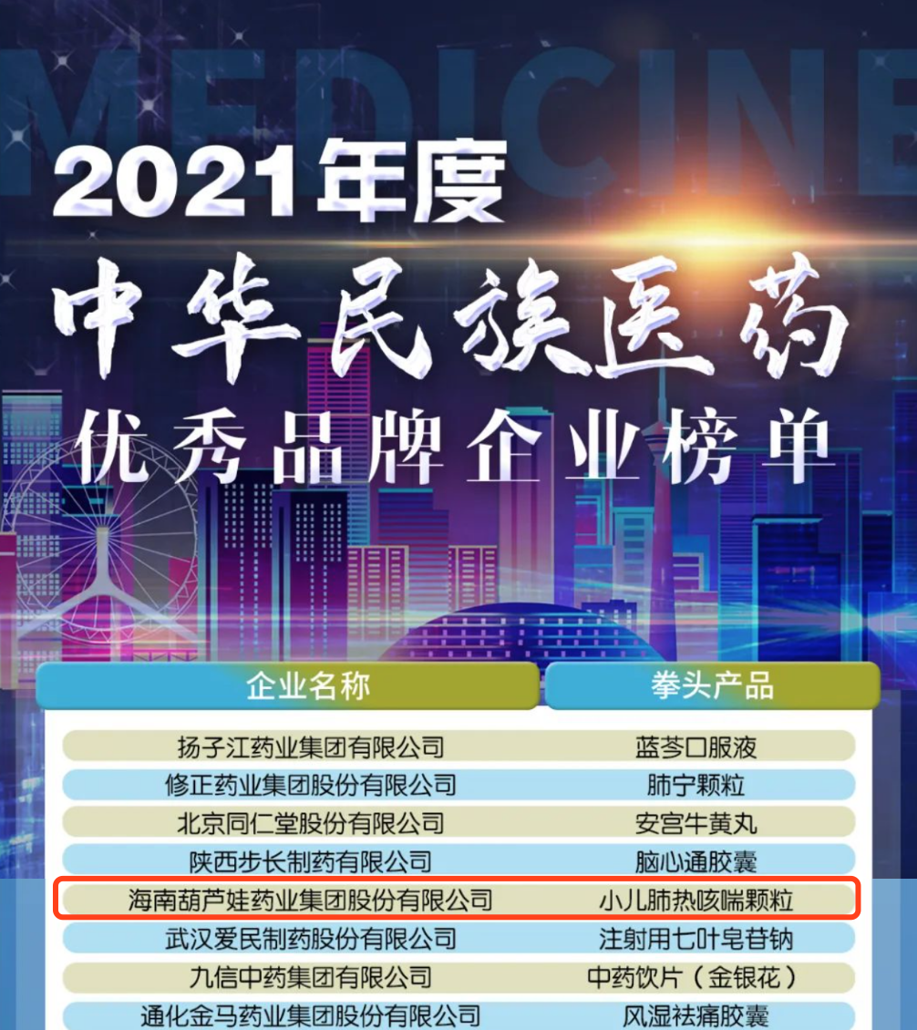 12月29日,全国工商联医药业商会发布了“2021年度中华民族医药优秀品牌企业榜单”,DG视讯药业集团凭借黄金单品小儿肺热咳喘颗粒(4克)实力登榜。